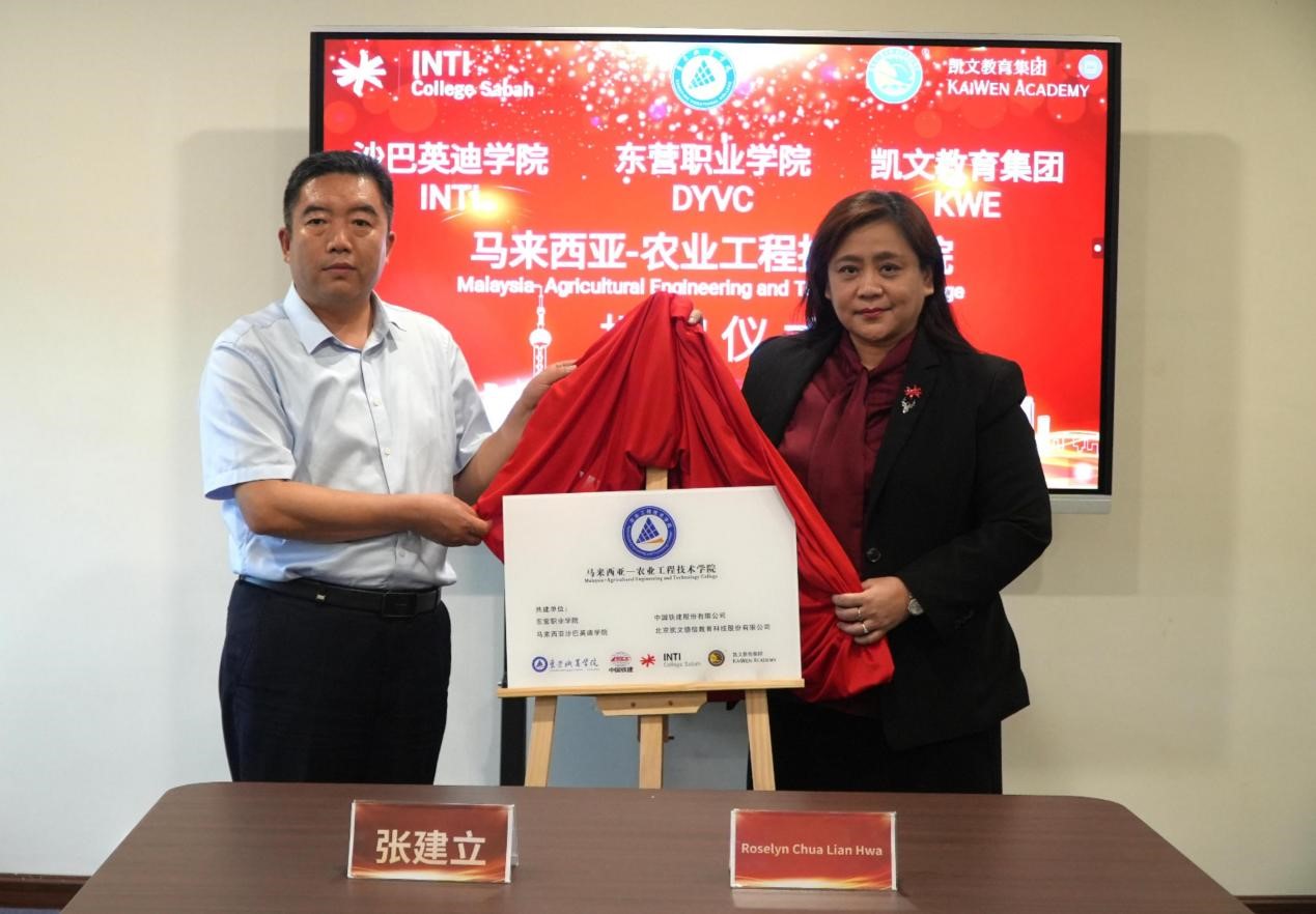 Today, under the coordination and promotion of the Sabah Belt and Road Higher Education Association, the signing and unveiling ceremony of the Malaysia Institute of Agricultural Engineering and Technology, jointly established by INTI College Sabah, Dongying Vocational Institute, and Beijing Haiguotou Group Kevin Shandong Branch was grandly held at INTI College Sabah, Malaysia. The Deputy Chairman of the Invest Sabah Berhad, Mr. George Wong,the Secretary-General of the Sabah Belt and Road Higher Education Association, and other distinguished guests attended the event, witnessing an important milestone in China-Malaysia agricultural technology education cooperation.